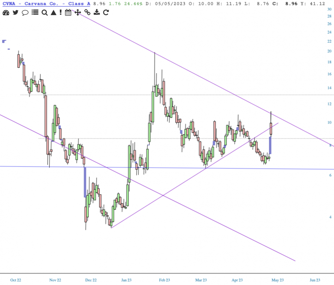 Two choices for CVNA. Either pop up out of the purple channel, or loose support of the blue trendline.