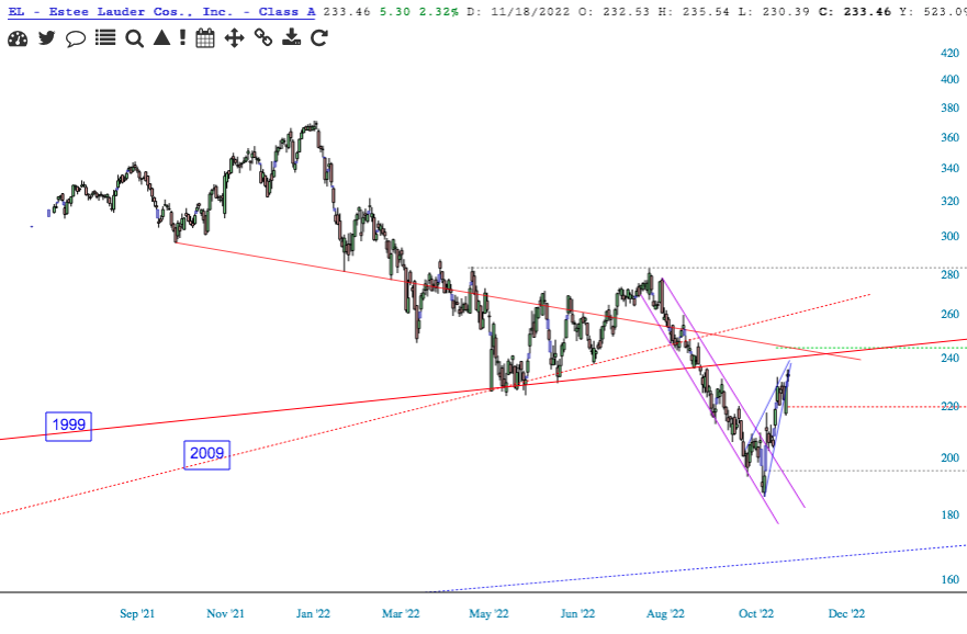 EL - Big run-up the past several weeks, approaching major resistance, having broken uptrends from 1999 and 2009.