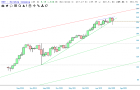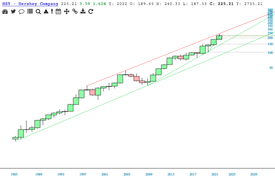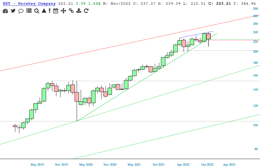 HSY pressing up against a broken uptrend of the 2020 low.