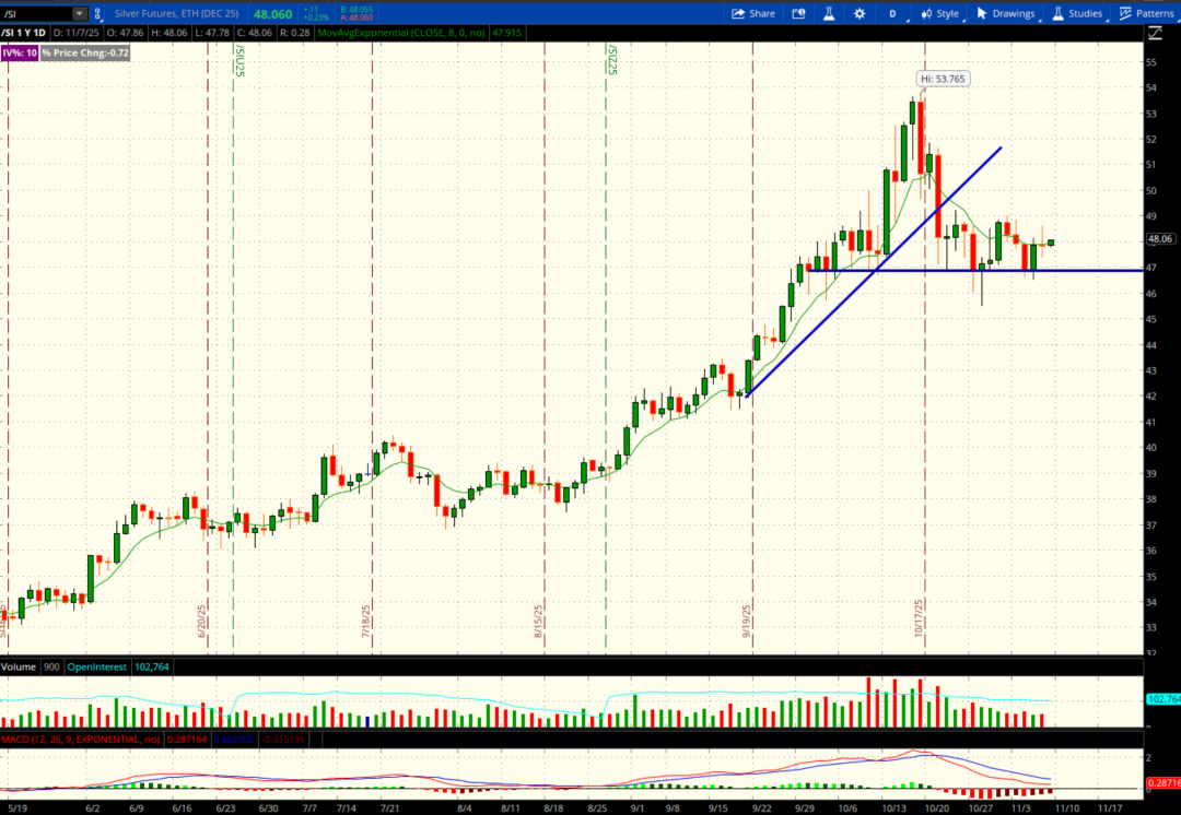 Sell signal for /SI if price falls below green dashed trendline.