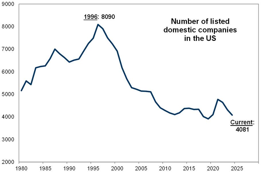 after a very long period of decline, the number of publicly-listed US companies saw a hook higher in both 2019 and 2021, before retracing again in the past few years.