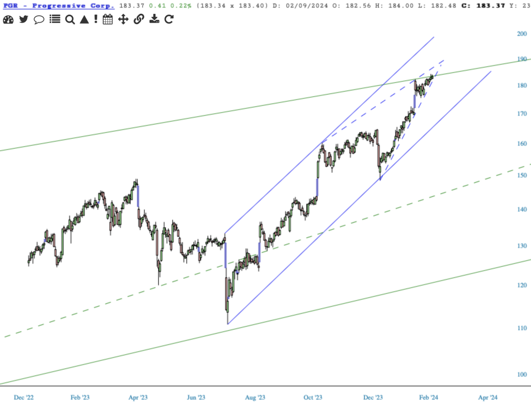 PGR - Progressive. Having recently obtained rate hike approvals, now charging exorbitant insurance premiums, the company doesn't deserve this chart.