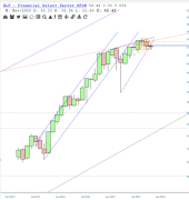 XLF - Broken support, then solid-as-you-please backtest of lower red dashed trendline. The Ichimoku Cloud lines consider this chart bearish.
