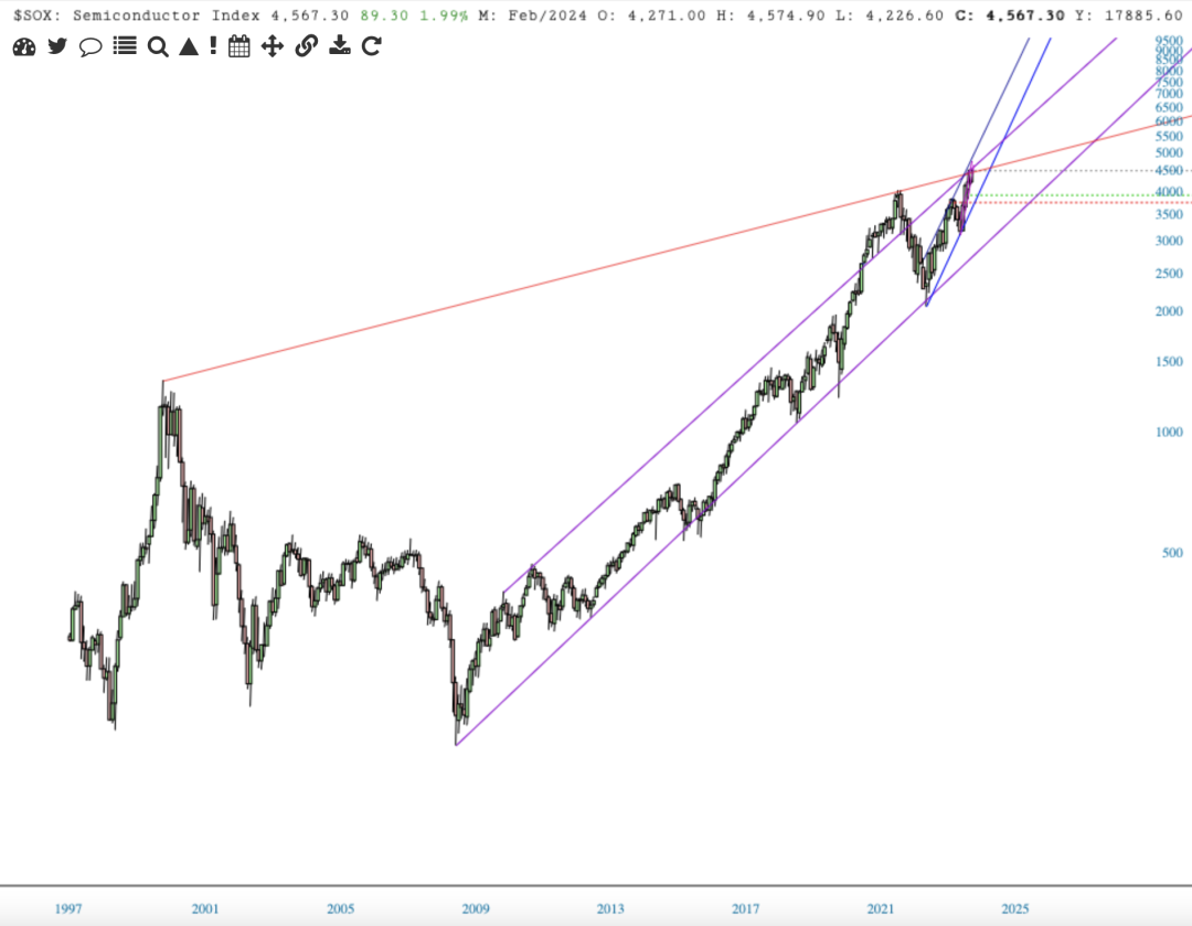 On Friday $SOX broke out above long term resistance trendline from 2010. It may be slim, but the chance to stop the upward momentum lies in whether the top of the purple channel is capable to turn Friday's rise into a double top.