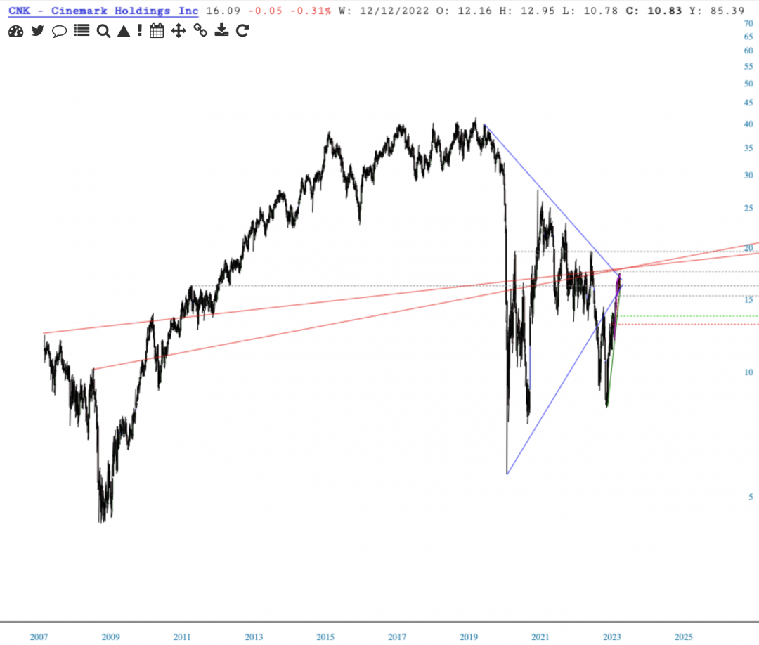 CNK has tested the top of the channel, and broken support of the uptrend from the Mar low.