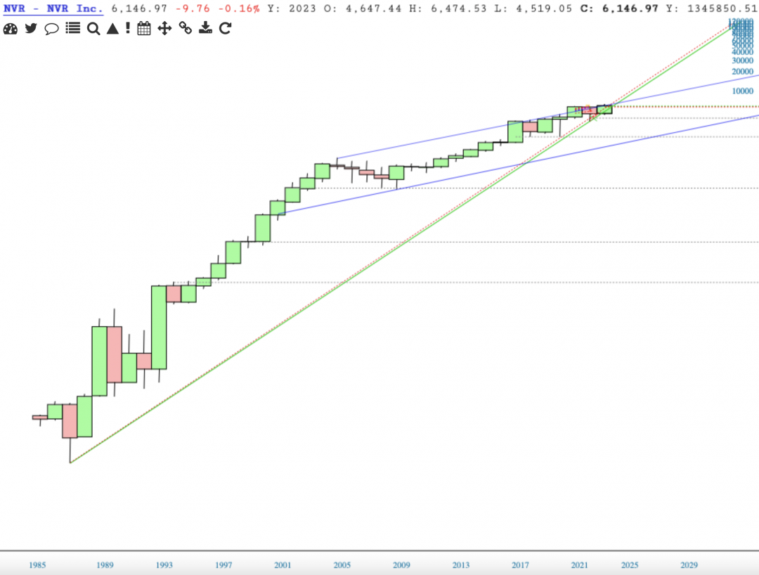 Pretty little top on NVR. Price broke below support of the 1987 trendline, fighting to get back above. Green and red horizontals are the Ichimoku Cloud.