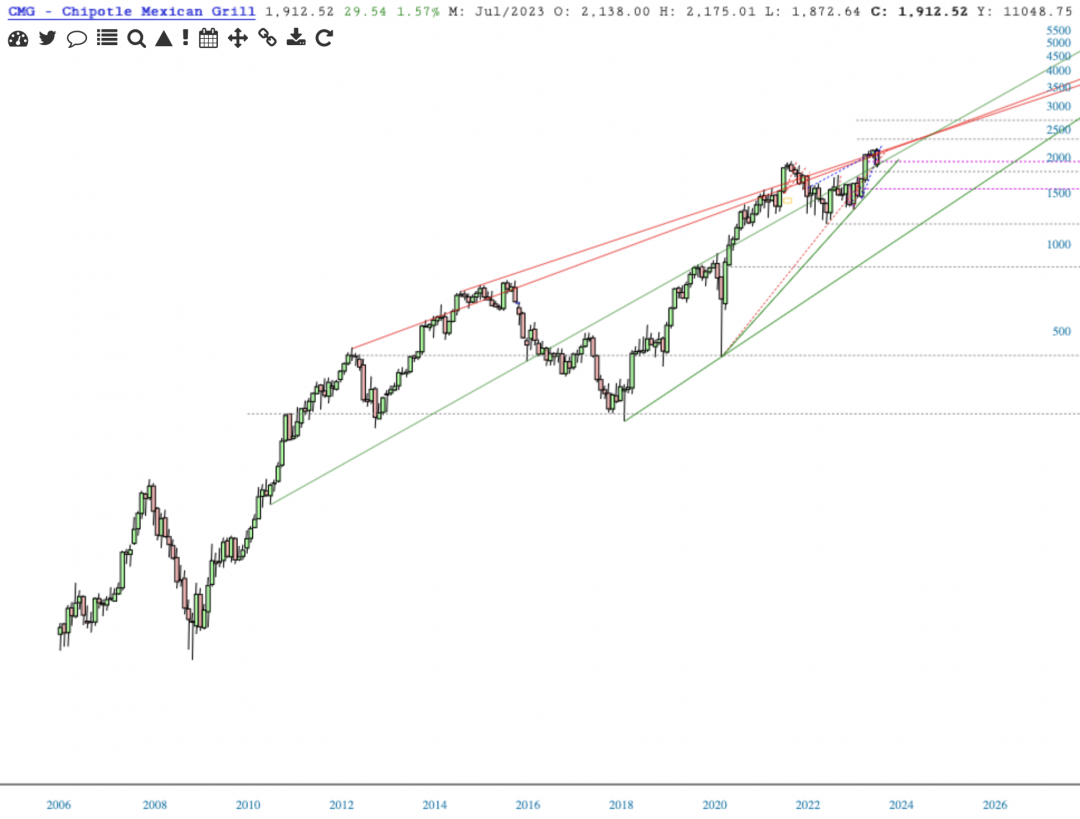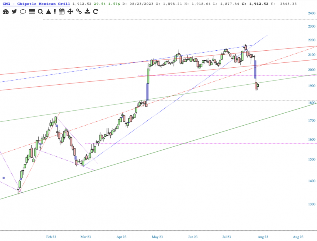 CMG getting hit where it matters. It may go up near term, but falling below all the red lines points to lower prices before resuming the uptrend in earnest. Gap at 1816.96. Below that, watch for support around 1583.