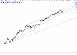 Next up, last vestige support of 1997 uptrend (bottom green).