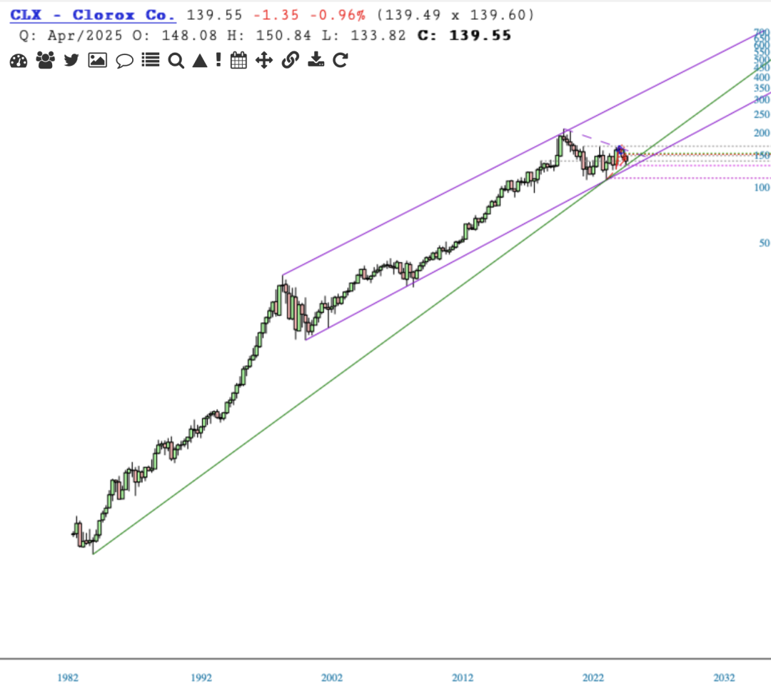 CLX has struggled mightily since its double top in Dec 2024. Heading lower once again. Bottom green trend line since 1984 is the final stronghold.