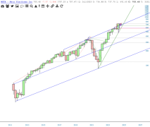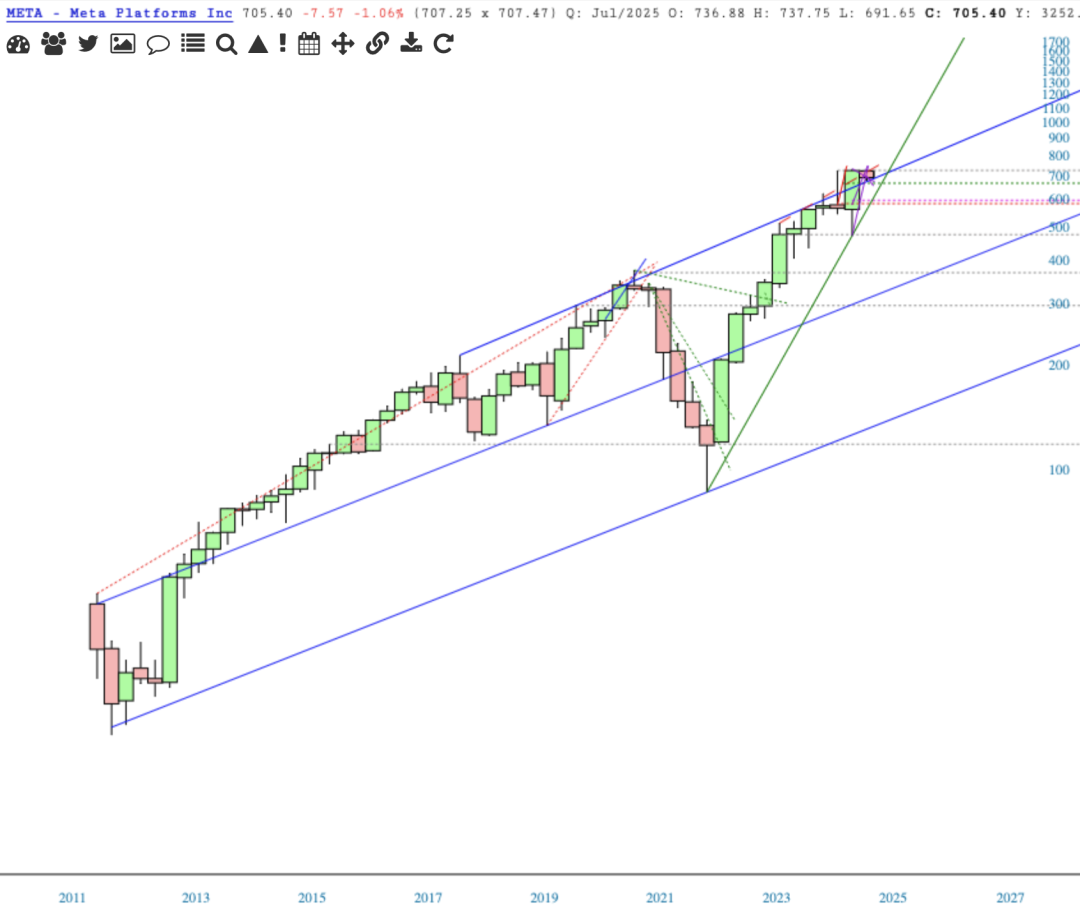 META fell from a bearish rising wedge two weeks ago, channeling lower since and printing a bearish engulfing candle today. Thick Ichimoku Cloud with a gap toward the bottom of it at 606.50.
