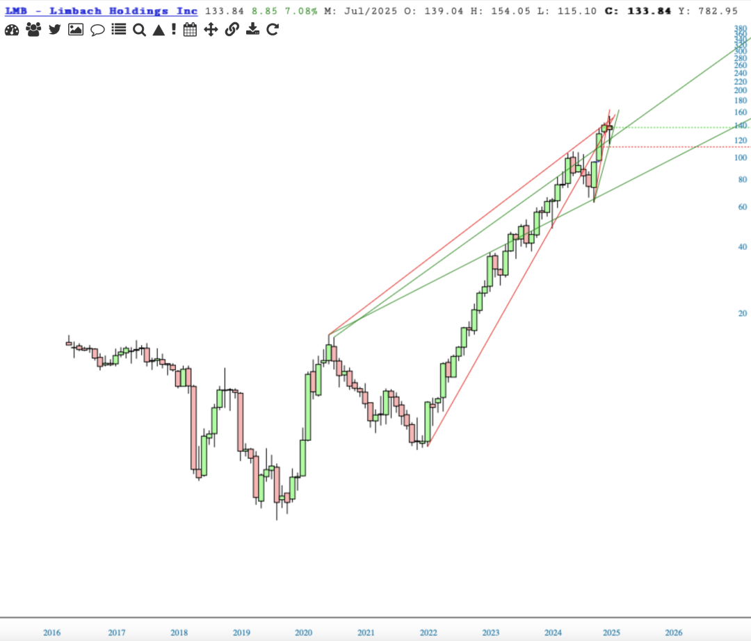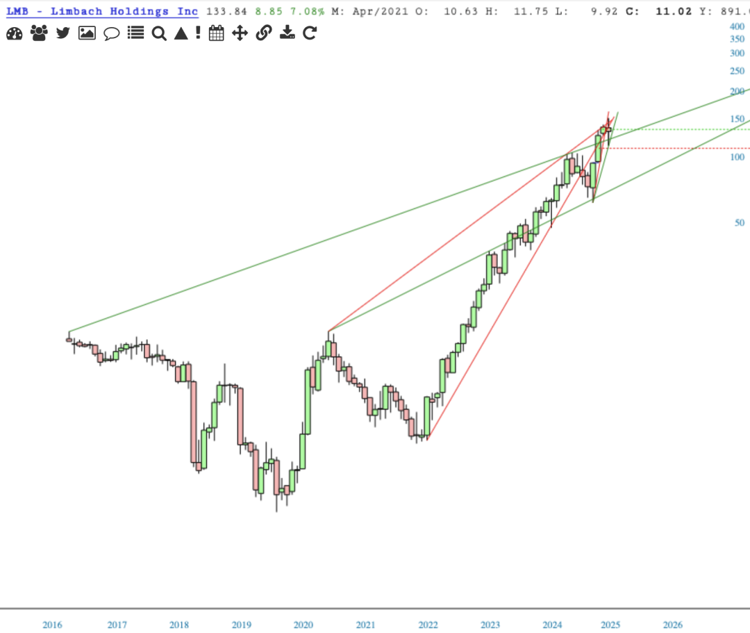 LMB - Three red lines of wipeout begun two weeks ago - still looks poised for more downside. Red and green horizontals