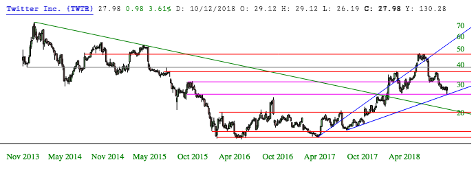 Break below blue TL and fuchsia Support, portends decline for TWTR.