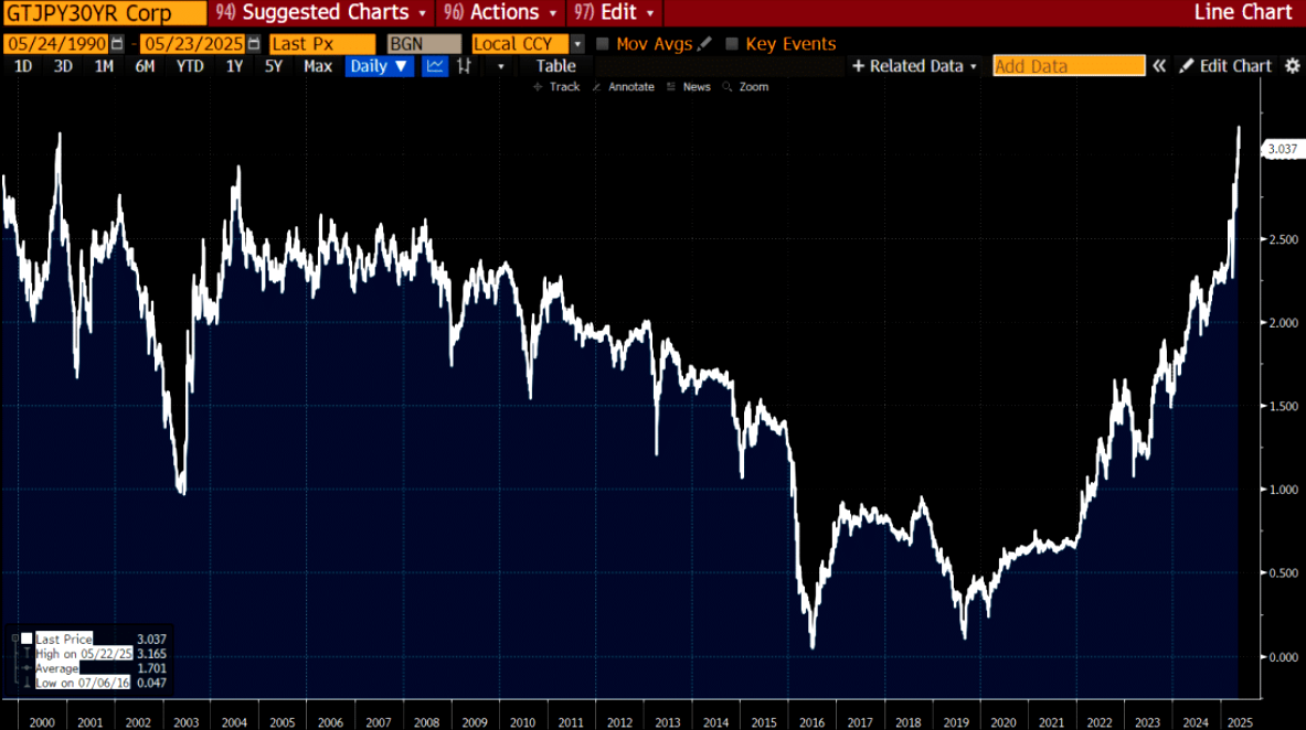 Japan is facing an alarming swift repricing of long-dated fixed income. 30 year yields now >3%, again – levels not seen in the last 25 years.