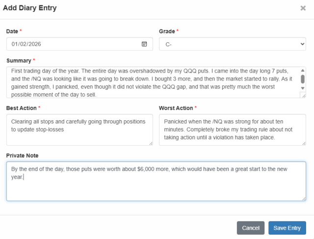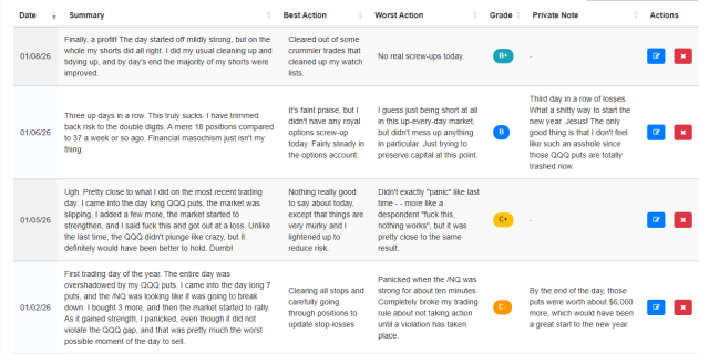 - Grade: this is the grade you give yourself for your performance. It doesn’t necessarily relate to profits and losses. You may lose money but give yourself an “A” because you executed really well and managed your emotions, and likewise you may make big profits but give yourself a poor grade if you messed up somehow. It’s just a quick-take on how you view your own behavior.