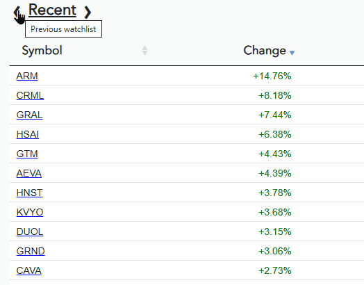 You can also access these watch lists without SlopeCharts by way of this menu in order to get up-to-date quote. Please note that the only quotes displayed will be equity quotes (not futures, indexes, crypto, etc.)