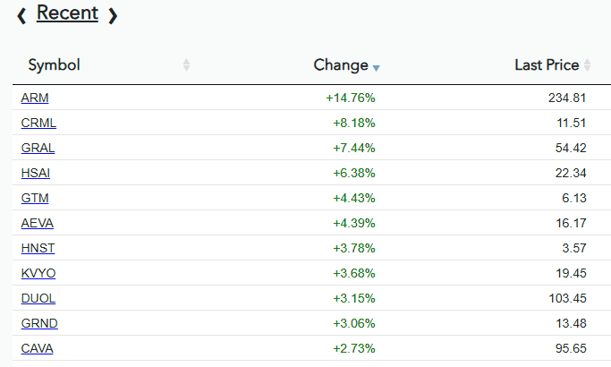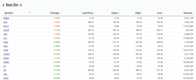It’s basically what you would expect: all of your watch lists (as created and managed in SlopeCharts) with the most recent price data and percentage change.
